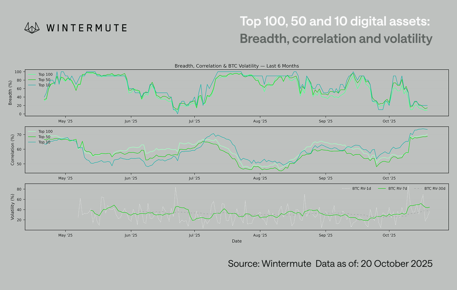 Breadth (% of tokens with +ve price activity over past 30days) remains narrow, with only 20–25% of tokens, while intracorrelation between cohorts is near summer highs consistent with a market driven by top-down macro rather than idiosyncratic factors. Realised volatility in BTC sits at a six-month high post-liquidations, but implied vols are stable, indicating digestion rather than renewed stress.