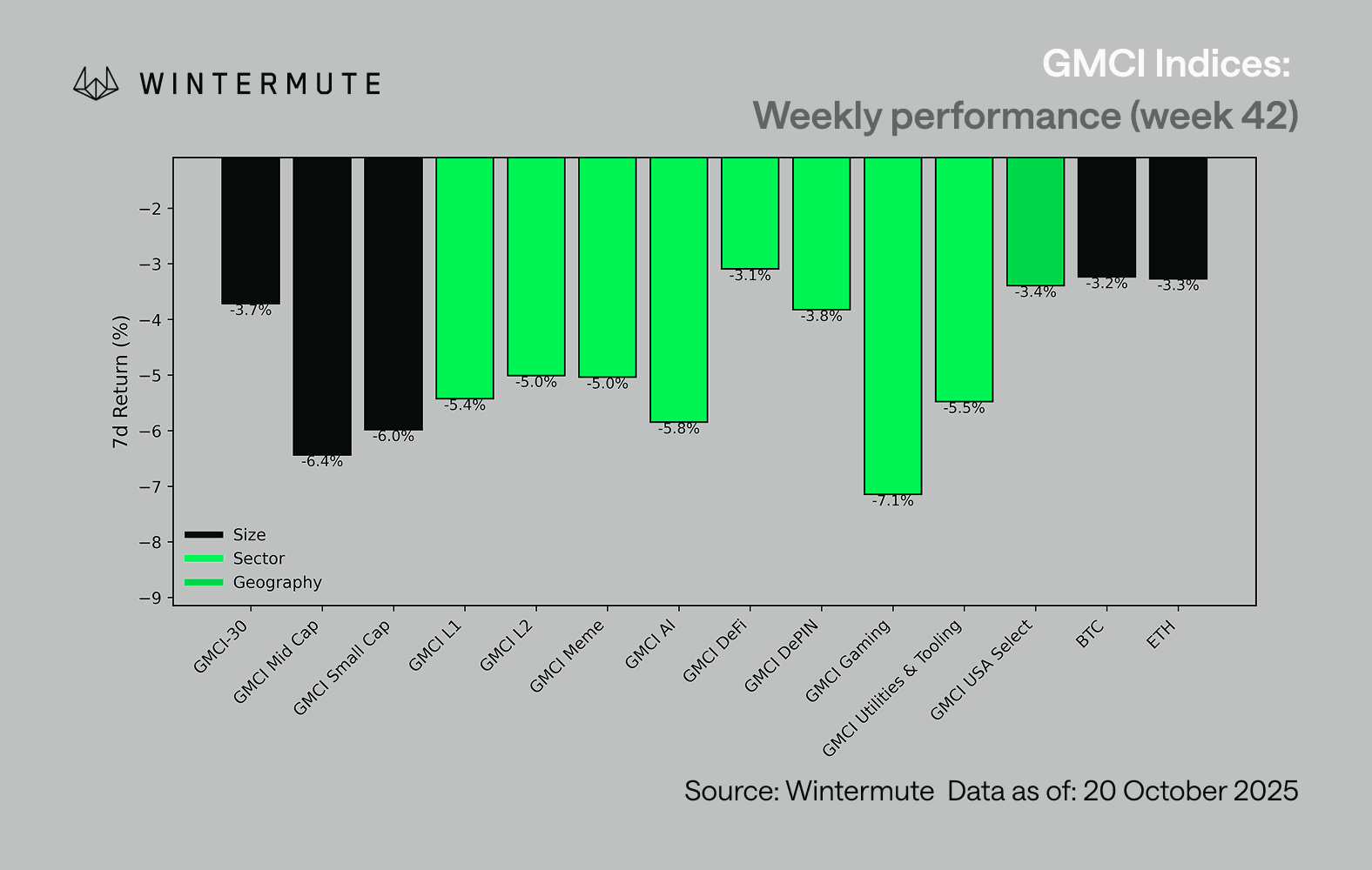 Looking at the index level, digital assets declined across all sectors, with the GMCI-30 down 3.7% for the week. The pullback was broad-based, led by Gaming (-7.2%) and AI (-5.9%), while Layer 1s, Layer 2s, and Meme tokens each fell around 5%. DeFi (-3.1%) and DePIN (-3.8%) were comparatively more resilient, while BTC (-3.2%) and ETH (-3.3%) mirrored the broader market trend.